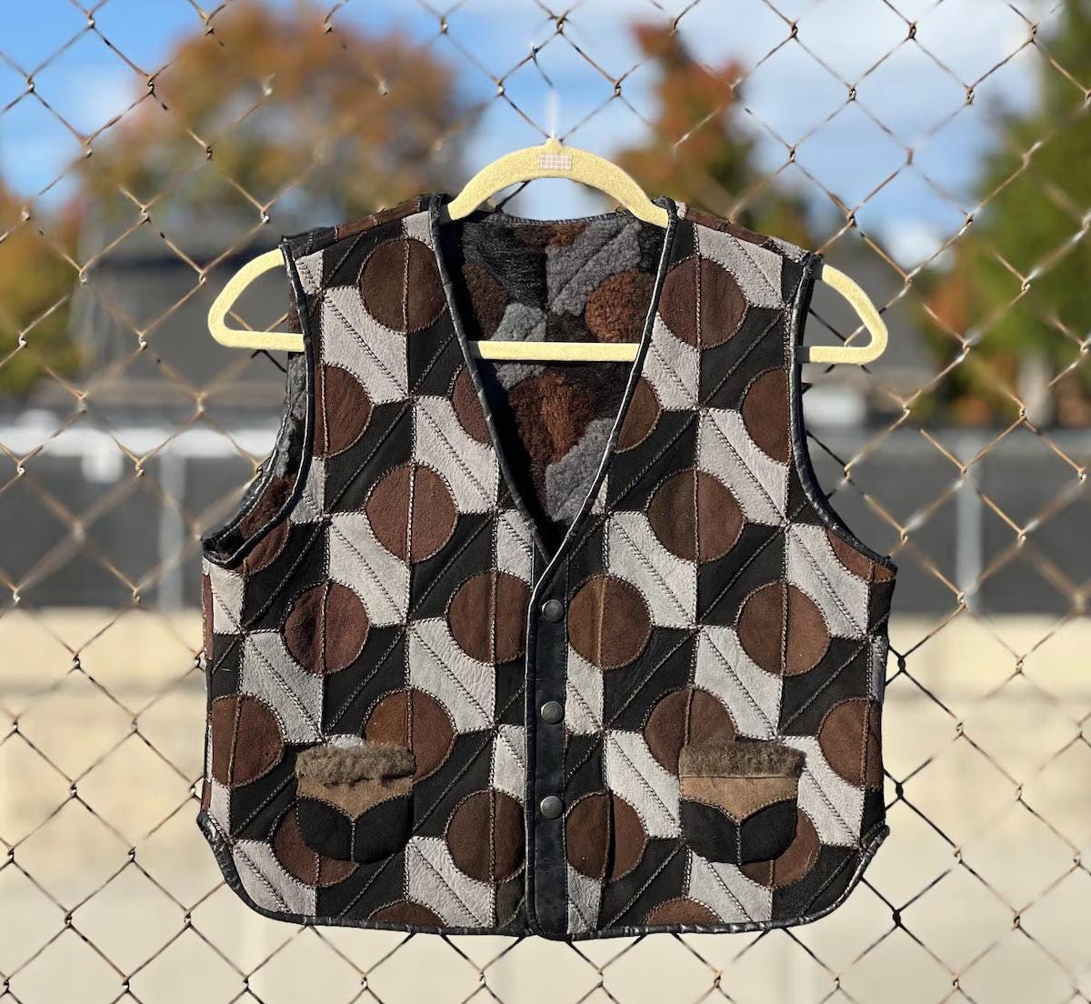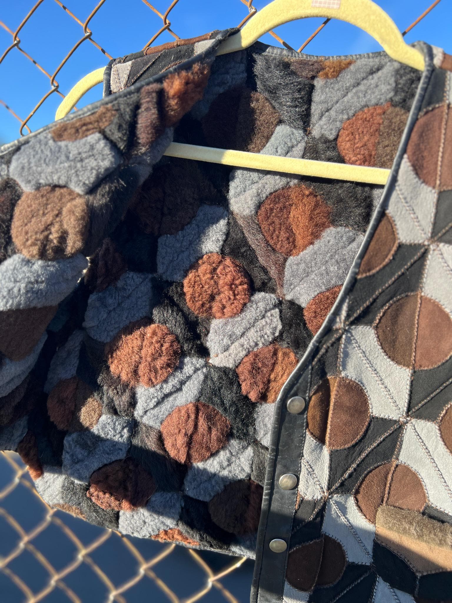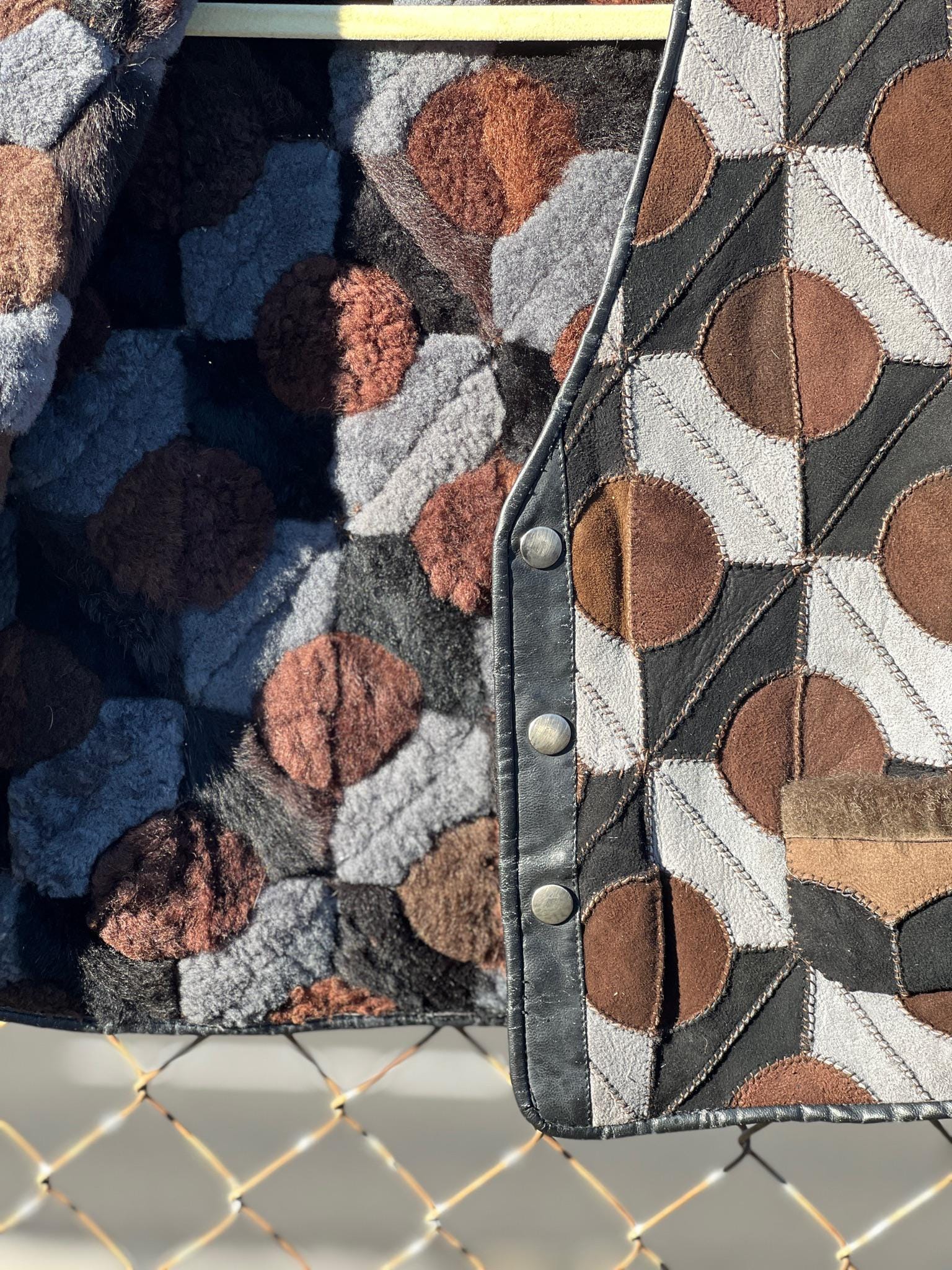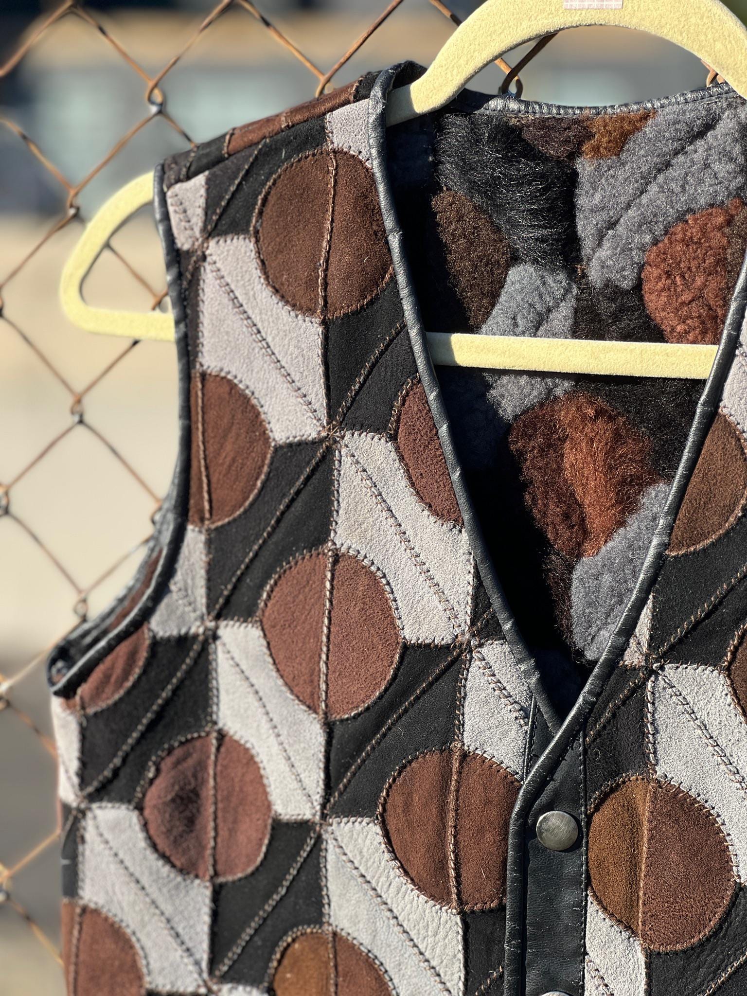This incredible 1970s patchwork suede vest features a bold geometric circle pattern in rich shades of chocolate brown, gray, and black. Fully lined in cozy shearling-with the same circular motif on the interior-it's warm, tactile, and visually striking from every angle. Finished with a snap-button front and two small pockets, this is a true statement piece with timeless craft.