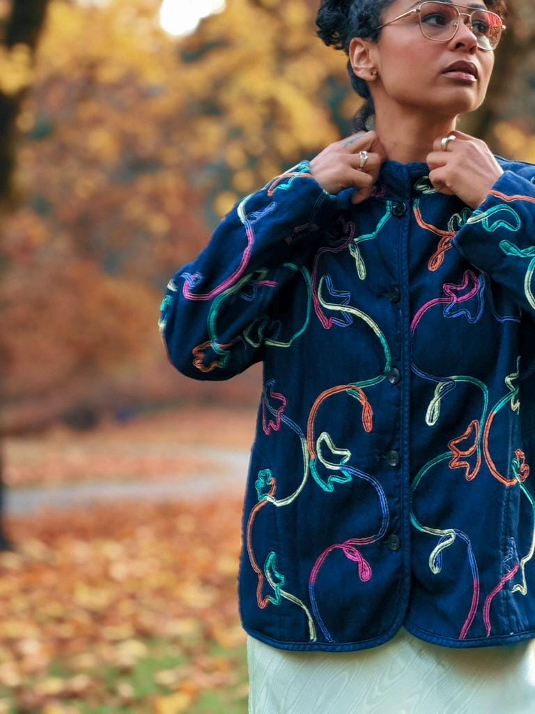 This Koret jacket features a rich deni-like base accented with multicolored ribbon embroidery for a subtle pop of texture and detail. Made from a comfortable cotton-rayon blend, it's lightweight yet warm enough for cooler evenings and easy layering. A classic 1990s piece with just the right amount of funky decorative charm.